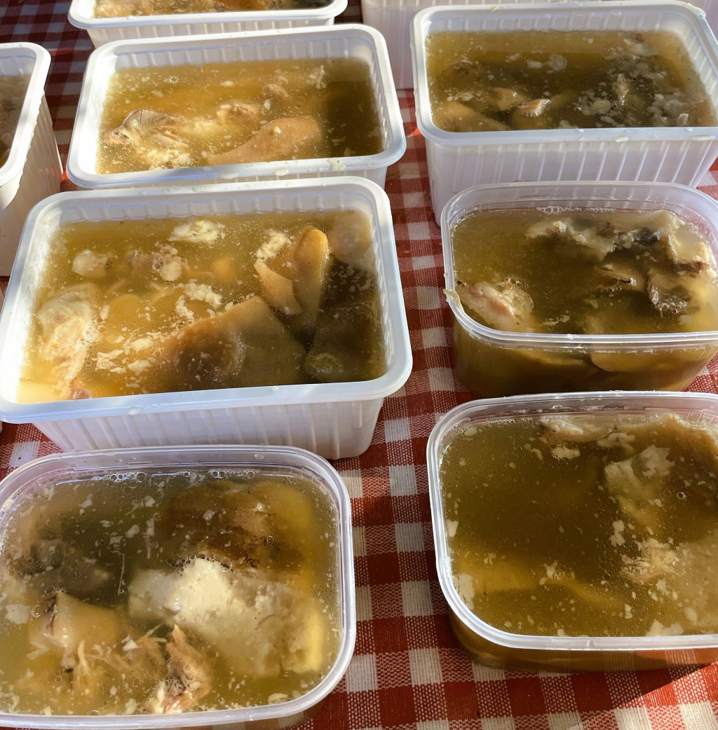 Kocsonya Összetevők: Víz, kocsonyahús (fejhús, bőrke, bontott csülök, köröm), vöröshagyma, fokhagyma, só.
