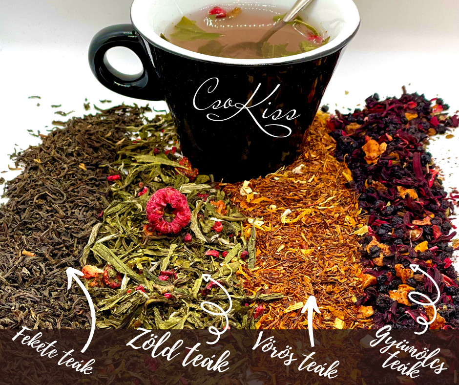 Prémium szálas teakeverékek a CsoKiss Manufaktúrától. Zöld teák , Fekete teák, Gyümölcs teák és Roiboos (vörös) teák közül választhattok. 100g/tasak kiszerelésben. A zöld teák közül az Oolong tea kiszerelési mennyisége 50g/tasak.