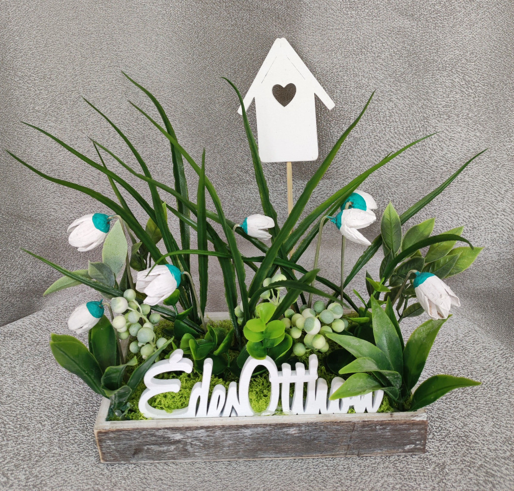 Hóvirág fa ládikában. Csalogasd be a tavaszt az otthonodba! A hóvirágok kézzel készítettek (fúrással, festéssel). Édes otthon felirattal. A kompozíció mérete: kb. 21 cm széles és 25 cm magas. Kedves, letisztult ajándék lehet születésnapra, névnapra, Nőnapra, Anyák napjára vagy csak úgy, az otthon(od) díszeként.
