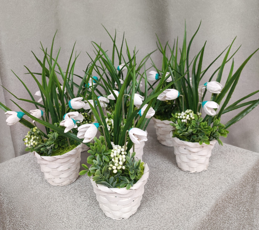 Hóvirág kompozíció, élethű, gondozásmentes. A hóvirágokat kézzel készítettük: fúrtunk, festettünk, stb. Bambusz kaspóban. Letisztult, kedves ajándék lehet Nőnapra, születésnapra, névnapra, Anyák napjára vagy csak az otthonod díszeként. Kb. 30 cm magas. Az ár 1 cserépre vonatkozik!