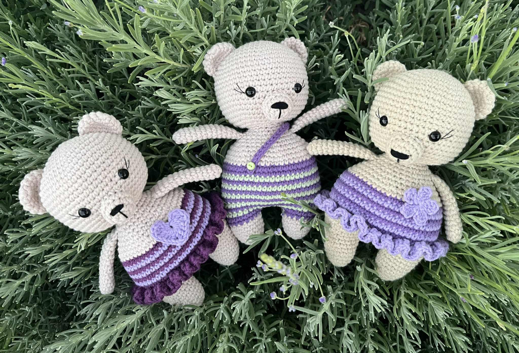 Szárított levendulával töltött horgolt maci (fiú). A megrendelés színe a feltöltött képtől eltérhet, de a harmonikus lilás színvilág garantált! A termék 3 éves kor alatt gondos odafigyelés mellett használható!