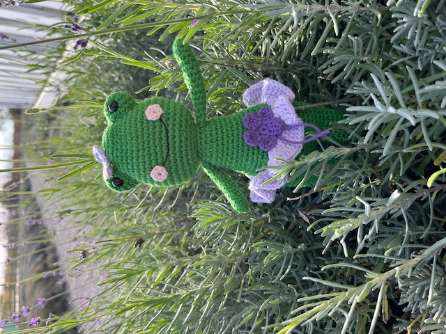 Szárított levendulával töltött horgolt békalány. Egyedi kézműves termék.