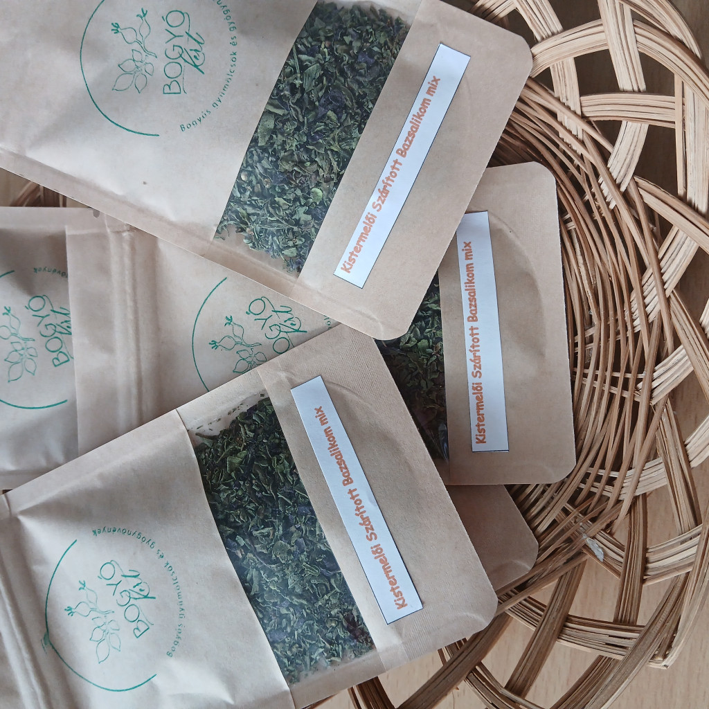 5 féle bazsalikom egy tasakban - Genovese, saláta levelű, citrom illatú, lila bazsalikom és fahéj illatú bazsalikom Illata nagyon intenzív, színe gyönyörködtet. Bármilyen paradicsomos ételbe, salátára, öntetekbe, pácokba ajánlom.