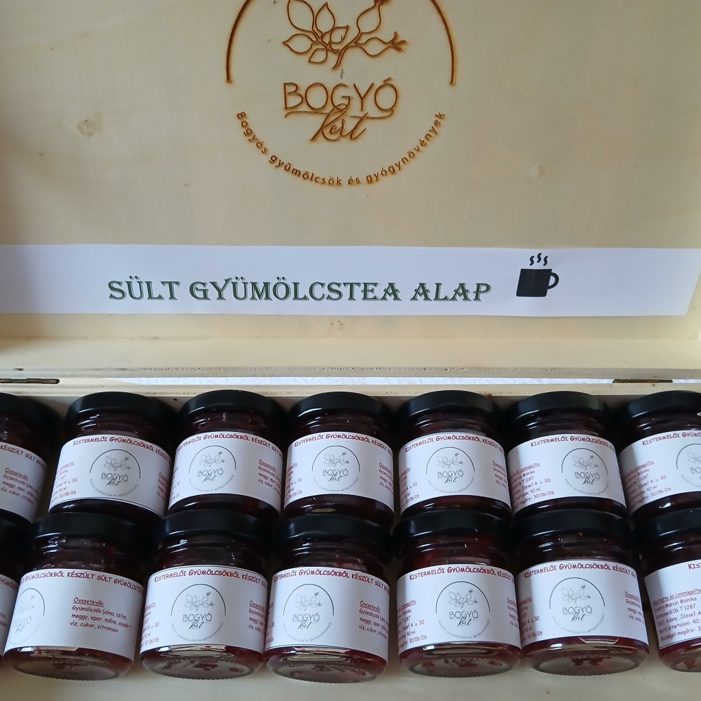 Gyümölcsök a kertemből, sütőben összesütve, beízesítve, egy bögre meleg, vagy hideg valódi gyümölcstea elkészítéséhez. Összetevők: Alma, szilva, málna, meggy, eper, szeder, víz, cukor, citromsav, őrölt gyömbér Elkészítési javaslat: 1 üvegnyi (40 ml) mennyiségű sült gyümölcsöt önts le 2,5 dl hideg, vagy meleg vízzel egy bögrébe, jól keverd meg és azonnal fogyasztható.