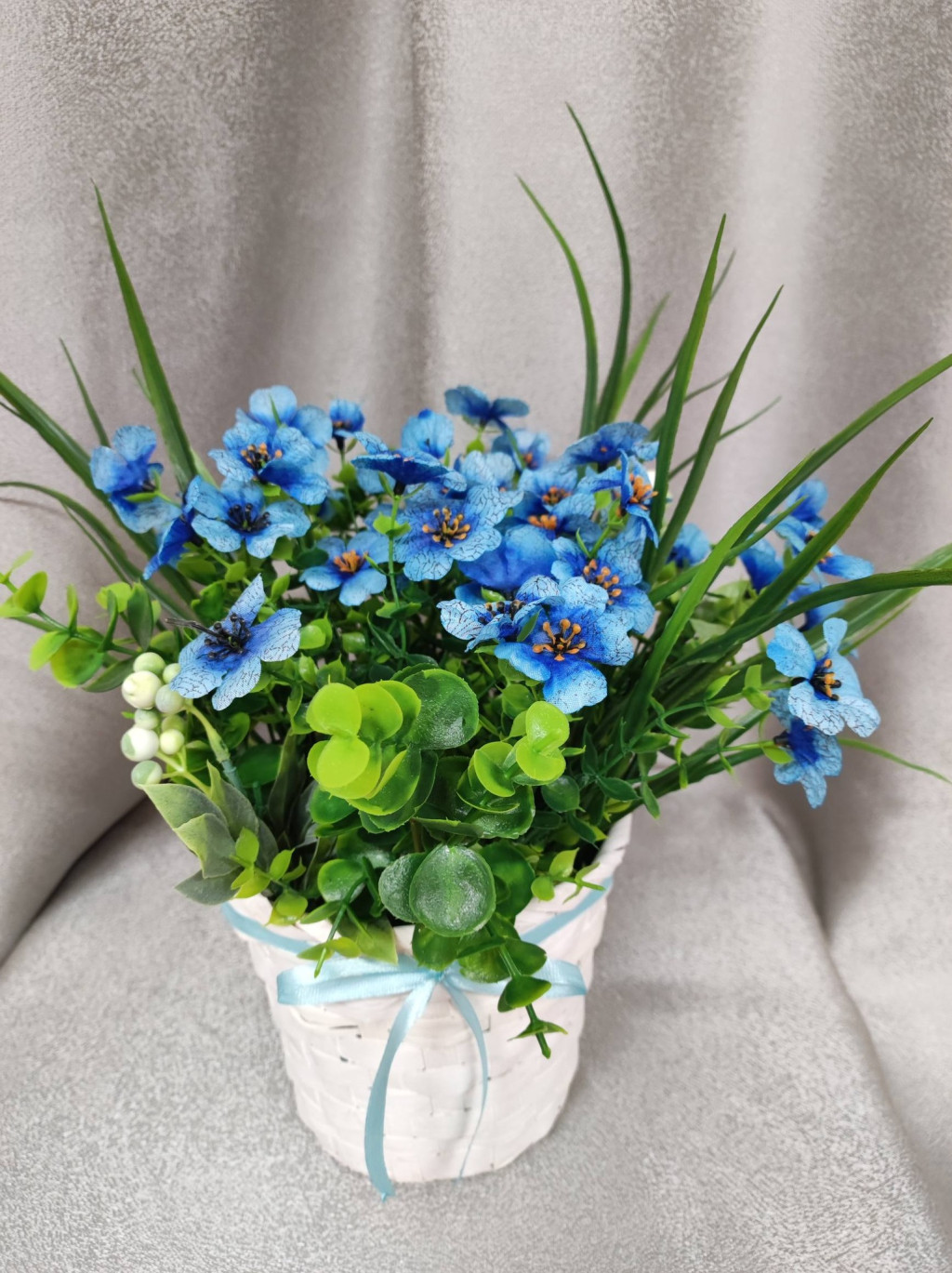 Ez a kék Angyalfüzér egy bájos, kézzel készített virágkompozíció, amely természetes bambusz kaspóban található, és azonnal otthonossá varázsolja bármelyik teret.