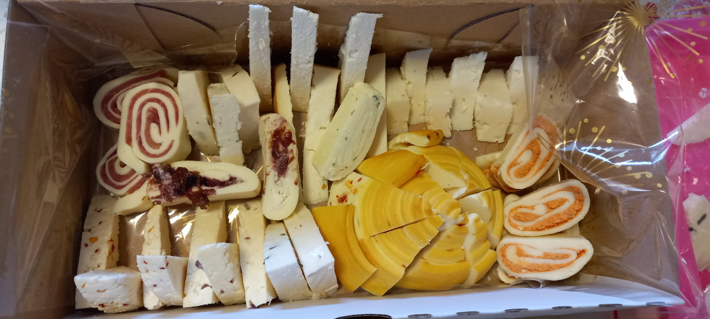 Gomolya sajtokból találhatók rajta snidlinges, natúr, füstölt, fokhagymás, chilis, lilahagymás, diós és borsos.