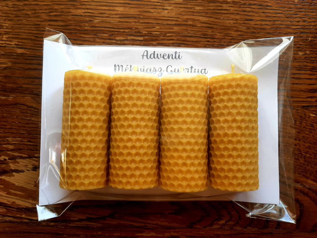 Tekert méhviasz gyertya – természetes fény és harmónia az adventi időszakra A 4 darabos, tekert méhviasz gyertya csomag tökéletes választás adventi koszorúhoz. A méhviasz gyertyák nemcsak gyönyörű, természetes fényt árasztanak, hanem számos jótékony hatással is bírnak: Tisztítják a levegőt, mivel égetés közben negatív ionokat bocsátanak ki, melyek megkötik a port és allergéneket. Természetes illatukkal megnyugtatják a lelket, és meghitt, ünnepi hangulatot teremtenek. Égésük tiszta és tartós, nem csöpögnek, és nem bocsátanak ki káros anyagokat. Kézzel készült, környezetbarát választás, 100% természetes méhviaszból, pamutkanóccal. Ez a négyes gyertyaszett az advent minden hetére fényt és békét hoz otthonodba – a természet ajándéka az ünnepi várakozás idején. Mérete: ~8x3,5cm