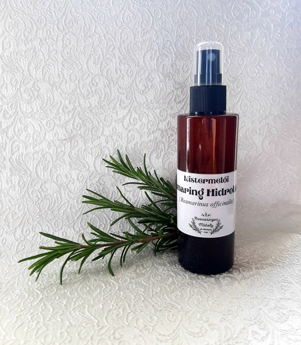 Rozmaring hidrolátum – természetes frissesség és vitalitás a bőrnek és hajnak A Rozmaring (Rosmarinus officinalis) hidrolátum a rozmaring illóolaj lepárlásának melléktermékeként készül, mégis rendkívül gazdag hatóanyagokban. Enyhe, friss illata és sokoldalú hatása miatt kiváló bőrápoló és hajtonizáló. Jótékony hatásai Bőrre: Élénkíti a vérkeringést, feszesíti és tonizálja a bőrt. Zsíros, problémás bőr esetén segíti a faggyútermelés szabályozását. Tisztító, antibakteriális hatású – csökkentheti a pattanások kialakulását. Hajra: Serkenti a hajhagymákat, elősegítheti a haj növekedését. Csökkenti a korpásodást, felfrissíti a fejbőrt. Lélekre: Frissítő, koncentrációt fokozó hatású – ideális tanuláshoz, munkához.    Használati útmutató Arctoniként: Permetezd közvetlenül a megtisztított arcbőrre reggel és este. Hajápoláshoz: Fújd a fejbőrre hajmosás után, majd finoman masszírozd be. Használhatod hajvízként a hajtövek erősítésére. Aromaterápiás frissítőként: Permetezd a levegőbe vagy textíliákra, hogy élénkítő, gyógynövényes illattal frissítsd a teret.     Figyelmeztetés Csak külsőleg alkalmazható! Száraz, hűvös helyen, napfénytől védve tárold. Felbontás után 6 hónapon belül használd fel. Allergiás reakció elkerülése érdekében először végezz bőrpróbát.   100ml-es kiszerelésben