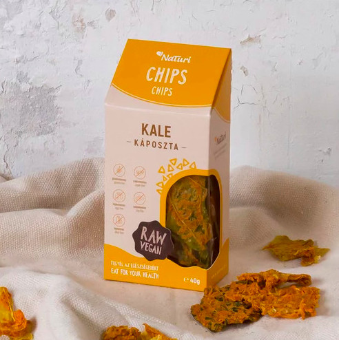Zöldség chips az átlagostól eltérő módon. A NaTuri aszaltak vezető terméke, mert annyira finom, szinte abbahagyhatatlan. Egy fantasztikus ropogtatnivaló, mely kelkáposzta marinált leveleiből készül. Egy speciális fűszeres szószba vannak beleforgatva a levelek, és kiméletesen aszalva. Szósz összetevői: Napraforgó mag, kesudió, fokhagyma, gluténmentes sörélesztő pehely, piros paprika, citrom, só. Glutén-, cukor-, tej-, tojás-, szójamentes termék Összetevők: kelkáposzta (80%), napraforgómag, kesudió, fokhagyma, őrölt pirospaprika, citrom, gluténmentes sörélesztő pehely, só Tömeg: 100g  Átlagos tápérték: Energi: 2274 kJ / 550 kcal Zsír: 36,9 g , - amelyből telített zsírsavak: 5,1 g,  Szénhidrát: 8,8 g, - amelyből cukrok: 8,2 g Rost: 13,9 g Fehérje: 21,4 g Só: 0,3 g