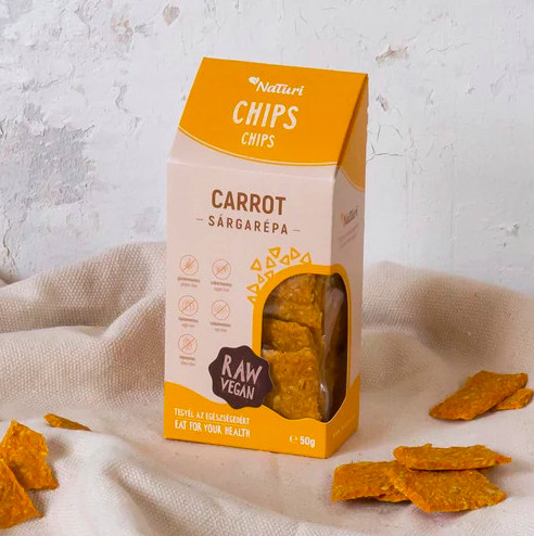 Sárgarépából, hagymából, fokhagymából, kápia paprikából és lenmagból készülő ízes, ropogós lapocskák. Zöldség chips az átlagostól eltérő módon. A NaTuri aszaltak vezető terméke, mert annyira finom, szinte abbahagyhatatlan. Fűszeres ropogtatnivaló lapocskákból álló termék, melyet sokrétűen lehet fogyasztani: tunkolni szószokhoz, salátákat gazdagítani, és krém levesekbe levesbetétként, vagy csak úgy ropogtatni. Glutén-, cukor-, tej-, tojás-, szójamentes termék Összetevők: sárgarépa (36%), lenmag, citrom, hagyma, fokhagyma, őrölt pirospaprika, kápia paprika, só Tömeg: 100g  Átlagos tápérték: Energi:1493 kJ / 360 kcal Zsír: 25,4 g , - amelyből telített zsírsavak: 2,2 g,  Szénhidrát: 10,7 g, - amelyből cukrok: 5,2 g Rost: 17,2 g Fehérje: 11,8 g Só: 0,3 g