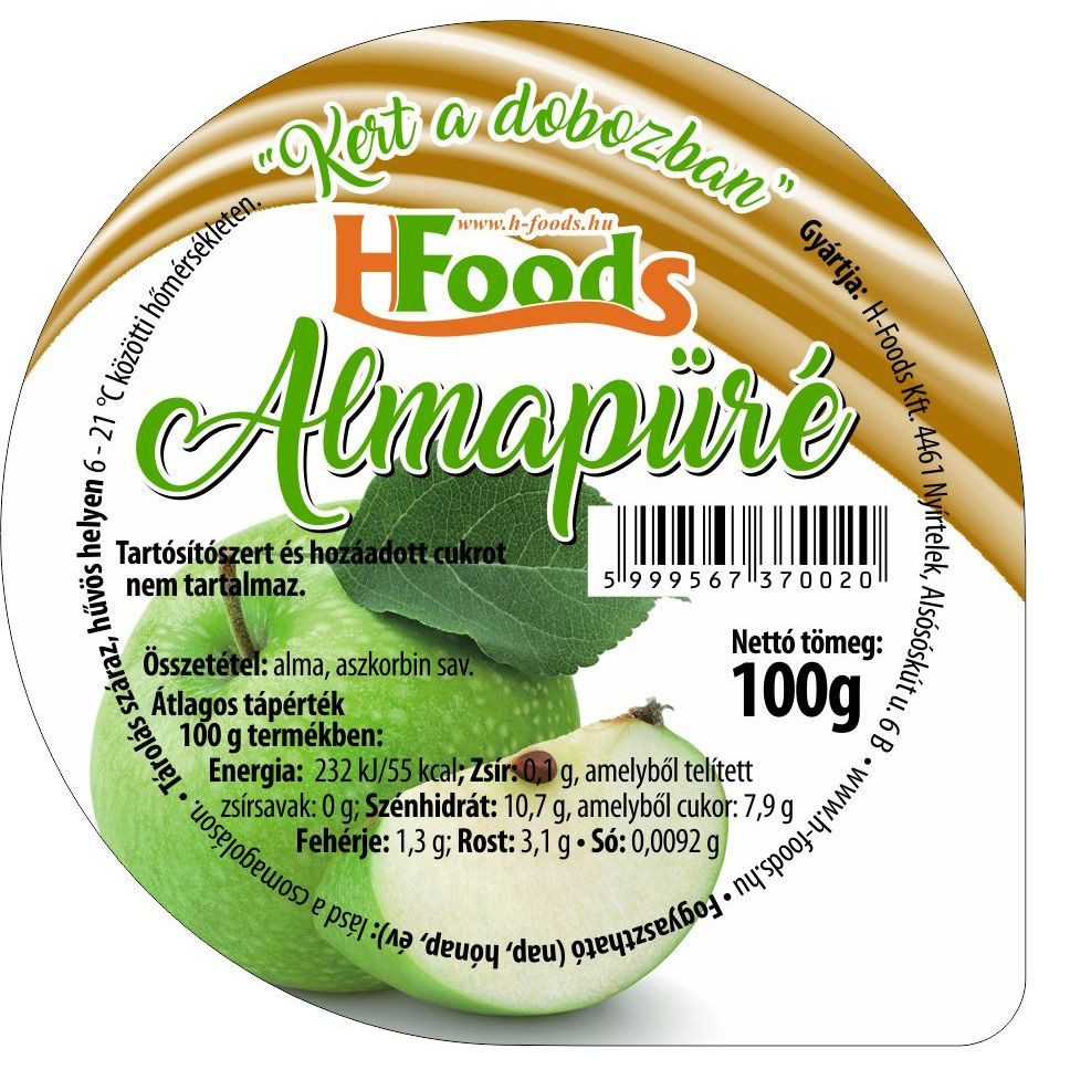 Egy tégelybe (100g) mintegy 200 g friss gyümölcs kerül. Hozzáadott cukrot, ként, citromsavat, tartósítószert, pektint nem tartalmaz. A gondosan átválogatott almát hőkezelés előtt, finoman rövid ideig sütjük melynek egyik fő szerepe a jellegzetes ízvilág kialakítása, a másik pedig a késztermék állag beállításának fontos része.  A fel nem bontott termék hűtést nem igényel, szobahőmérsékleten is nyugodtan tárolható. Előállító csarnokunkban külön odafigyelünk arra, hogy nem használunk és tárolunk semmilyen allergén élelmiszert. Gyártó: H-Foods Kft Nyíregyháza