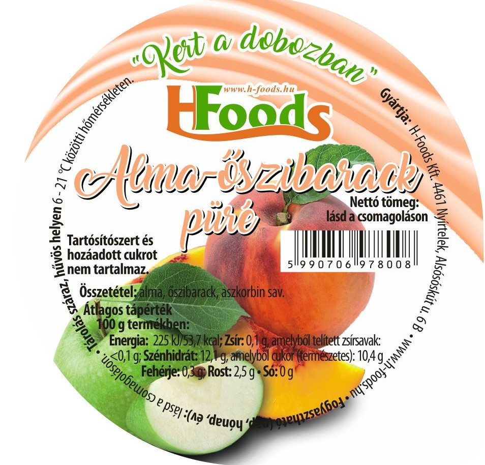 100% gyümölcs:  Alma(60%) és Őszibarack(40%) püré Egy tégelybe (100g) mintegy 200 g friss gyümölcs kerül. Hozzáadott cukrot, ként, citromsavat, tartósítószert, pektint nem tartalmaz. A gondosan átválogatott almát hőkezelés előtt, finoman rövid ideig sütjük melynek egyik fő szerepe a jellegzetes ízvilág kialakítása, a másik pedig a késztermék állag beállításának fontos része.  A fel nem bontott termék hűtést nem igényel, szobahőmérsékleten is nyugodtan tárolható. Előállító csarnokunkban külön odafigyelünk arra, hogy nem használunk és tárolunk semmilyen allergén élelmiszert.   Átlagos tápérték 100g termékben: Energia: 225 KJ / 53,7 kcal Zsír 0,1g- melyből telített zsírsavak