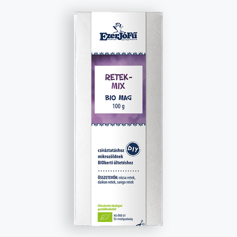 Bio magok: rózsa retek, daikon retek, rambo retek, hurrikán retek, vörös rubin retek Felhasználás: 100 g magból kb. 500 g csíra készíthető. A Bio Retek-Mix csíramag az Ezerjófű énkezű gyógyműves bio terméke. A csírák a természet csodálatos kincsei. A kicsi magban ott rejlik a kifejlett növény, apró, de tömény ehető formában.Tiszták, frissek, tápanyagokban, vitaminokban, ásványi anyagokban, enzimekben gazdagok. A csíráztatást mi magunk is könnyedén megoldhatjuk otthon. Nem kell hozzá kert. Csupán néhány egyszerű háztartási kellék szükséges hozzá. Néhány nap alatt finom, egészséges és mindenekelőtt friss zöldhöz jutunk, amit azonnal arathatunk és fogyaszthatunk is:) A csírák fogyasztása nagyon egészséges bármely korosztály számára, hiszen az apró növények telis tele vannak ásványi anyagokkal, vitaminokkal, enzimekkel és antioxidánsokkal. Nem utolsó sorban nagyon finomak, roppanósan frissek. Figyeljünk az alapanyagokra! Kizárólag ellenőrzött forrásból származó, kiváló minőségű magokat használjunk! Csíráztatás recept: - csíráztatásra alkalmas bio csíramagok - széles szájú nagyobb dunsztosüveg - gézlap - egy erős befőttes gumi - víz Csíráztatás: 1 - Szórjuk a csíramagokat az alaposan megtisztított dunsztosüvegekbe. Fontos, hogy egy üvegbe csupán egyféle magot tegyünk. (Azért kell a nagy üveg, mert a fejlődő csíráknak szükséges lesz a hely.) 2 - A csíramagokra öntsünk tiszta, hűvös, de nem jéghideg vizet. A víz éppen lepje el a magokat. Fedjük le az üveget a gézlapokkal. 3 - Hagyjuk ázni a csíramagokat annyi időre, amíg jól megszívják magukat. 4 - Öntsük le a vizet a magokról a gézen keresztül. 5 - Állítsuk az üvegeket világos, meleg helyre. Arra ügyeljünk, hogy közvetlen napsütés ne érje őket.  6 - 12 óránként mossuk át a magokat langyos, inkább hűvös vízzel. Ennek az a célja, hogy mindig nedvesen tartsuk, de ne áztassuk szét a csíramagokat. 7 - 1-2 napon belül megjelennek az első kis hajtások. (Az öblítést mindaddig folytassuk, amíg a csíranövények el nem érik a kívánt nagyságot.  Csíranövénytől és a csíráztatás külső körülményeitől függően 2-4 nap múlva, az első apró zöld levélkék megjelenésekor kivehetjük a csírákat az üvegből és megkezdhetjük a csíranövények fogyasztását. A csírák hűtőben körülbelül 1 hétig tárolhatók.