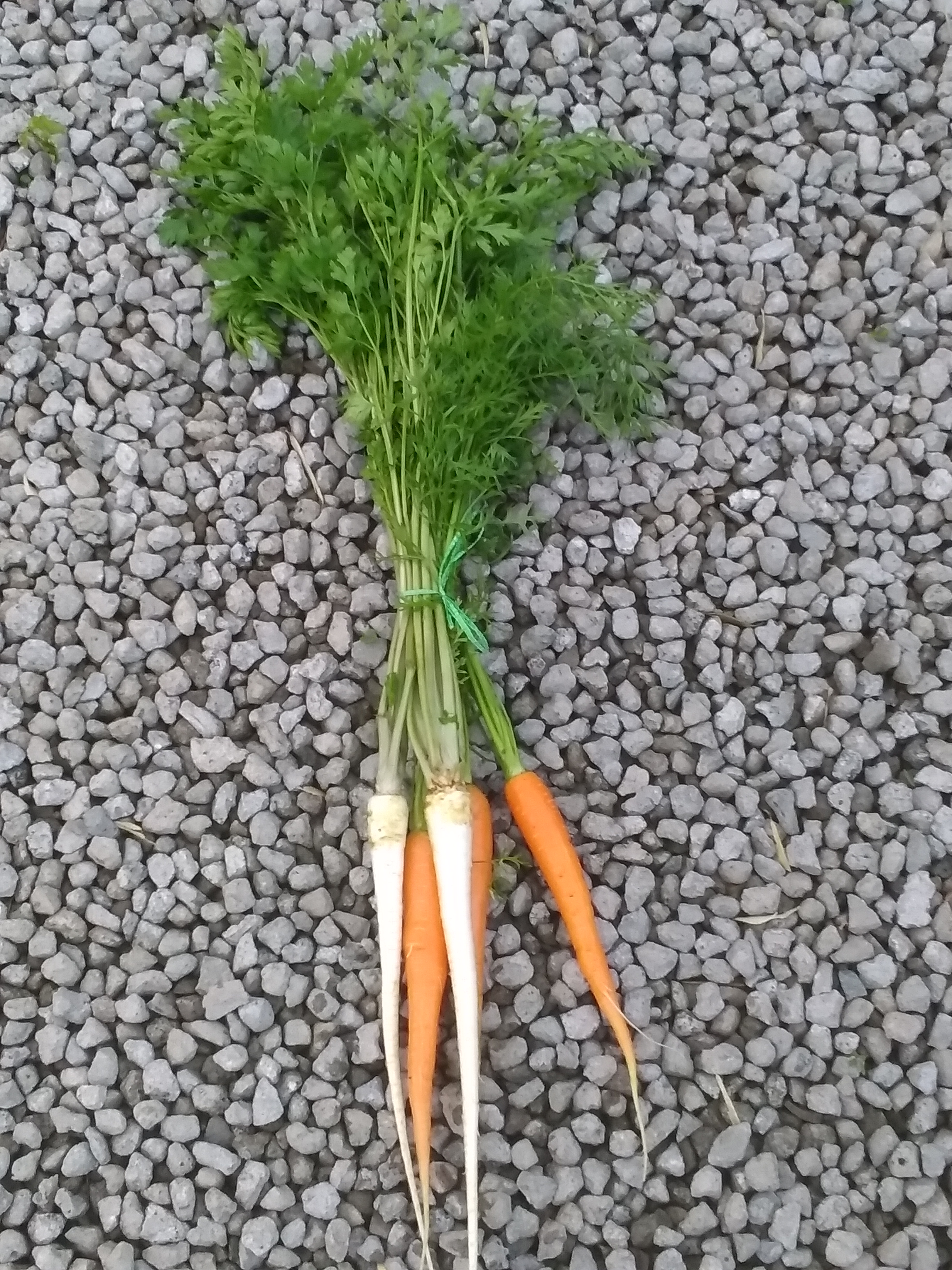 Zsenge sárgarépa és petrezselyemgyökér vegyes csomóban. A csomó 2db petrezselyemgyökeret és 3db sárgarépát tartalmaz.